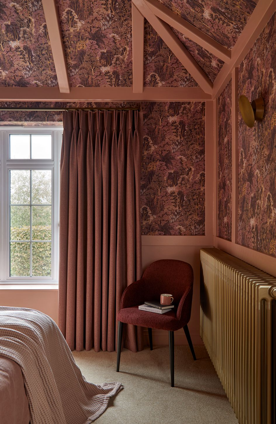 Cosy snug area designed by Kate Lovejoy Interiors in Maidenhead, featuring plum red sofa with textured cushions, statement lighting and a landscape backdrop.